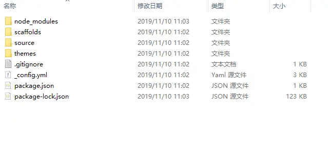 静静等待进度条走完,这样我们在 firstblog 这个文件夹中就有了 Hexo 初始化的相关文件。如图: