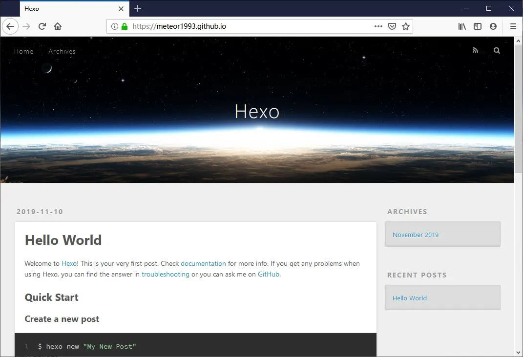 这时,我们就可以访问一下我们 Github Page 为我们分配的域名了,比如我的仓库名称为 meteor1993.github.io ,那我这里就要访问:meteor1993.github.io,结果如下: