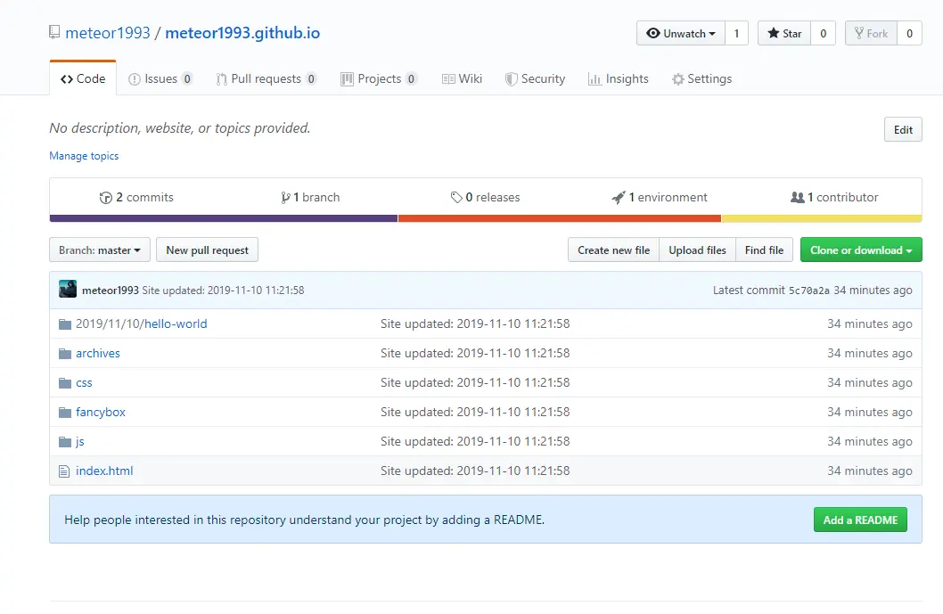 可以看到,这里就是将我们 public 目录下的所有文件上传了,Hexo 把编译之后的静态页面内容上传到 GitHub 的 master 分支上面去了。