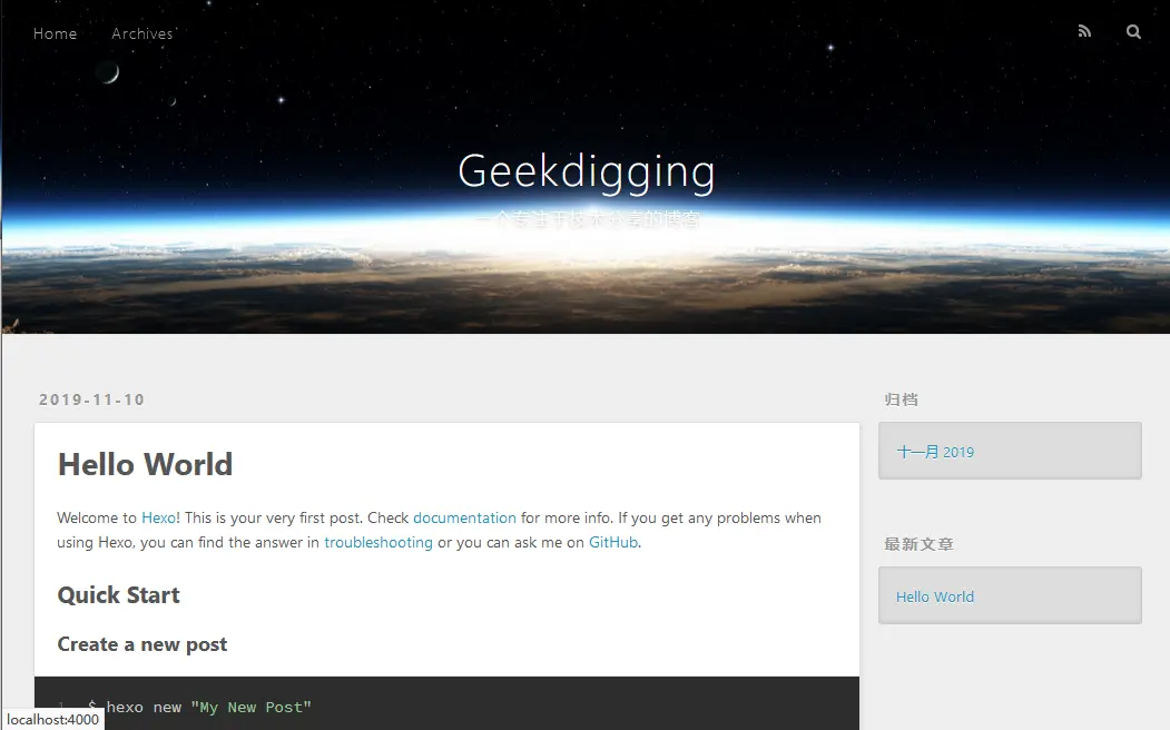 可以看到其中的时间日期格式变成了中文。这样我们就完成了博客的站点配置。
