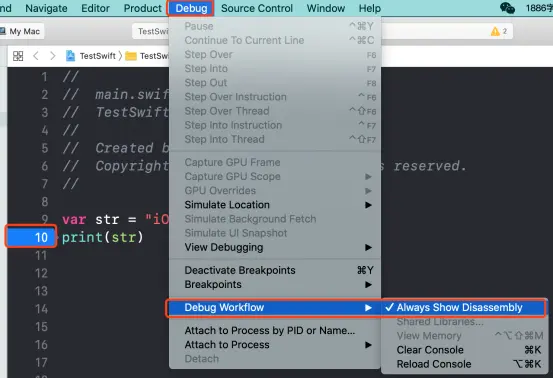 跟微软的 Visual Studio 一样,Xcode 也内置了非常方便的反汇编功能,可以轻松查看每一句代码对应的汇编指令,打开反汇编界面的步骤如下