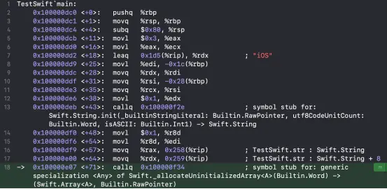 - 因此展示的汇编代码是基于 X64 的 AT&T 格式汇编,并非 iOS 真机设备的 ARM 汇编