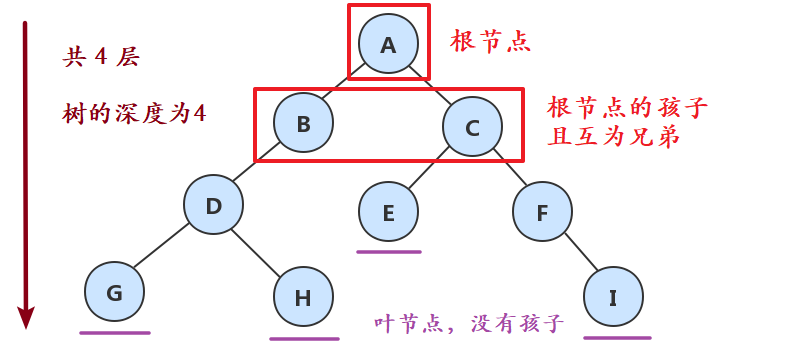 叶结点:也叫作终端结点,即没有后继的结点,例如 E F G H I