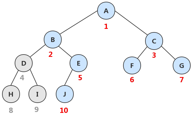 - 看着树的示意图,心中默默按照满二叉树的结构逐层顺序编号,如果编号出现了空挡,就说明不是完全二叉树