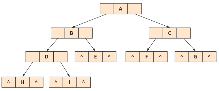 利用二叉链表结点就可以构成二叉链表,如下图所示: