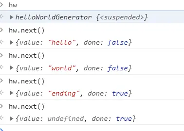 第四次调用,此时 Generator 函数已经运行完毕,next方法返回对象的value属性为undefined,done属性为true。以后再调用next方法,返回的都是这个值。