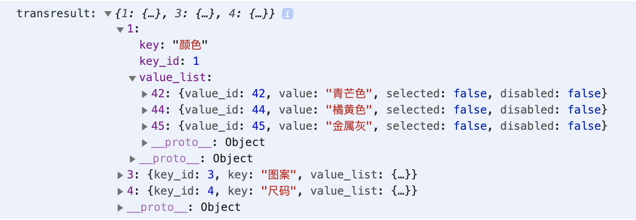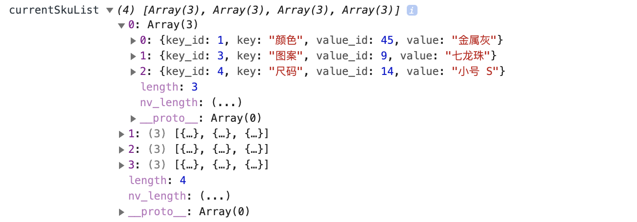 通过对currentSkuList当前单品列表的遍历和筛选,将其提取为上述数据格式的数据,这里使用对象而不是数组的方式是为了更方便的进行提取