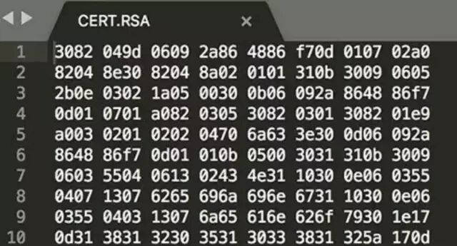 CERT.RSA。把之前生成的 CERT.SF 文件用私钥计算出签名, 然后将签名以及包含公钥信息的数字证书一同写入 CERT.RSA 中保存。需要注意的是,Android APK 中的 CERT.RSA 证书是自签名的,并不需要第三方权威机构发布或者认证的证书,用户可以在本地机器自行生成这个自签名证书。 Android 目前不对应用证书进行 CA 认证。打开CERT.RSA文件,内容如下图: