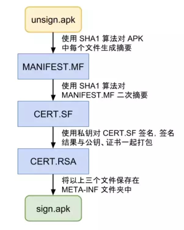 apksigner:Android sdk 提供的专门用于 Android 应用的签名工具。使用 pk8、x509.pem 文件进行签名。其中 pk8 是私钥文件,x509.pem 是含有公钥的文件。 生成的签名文件统一使用“CERT”命名。