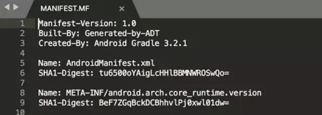 MANIFEST.MF。该文件中保存的其实就是逐一遍历 APK 中的所有条目,如果是目录就跳过,如果是一个文件,就用 SHA1(或者 SHA256)消息摘要算法提取出该文件的摘要然后进行 BASE64 编码后,作为「SHA1-Digest」属性的值写入到 MANIFEST.MF 文件中的一个块中。该块有一个「Name」属性, 其值就是该文件在 APK 包中的路径。