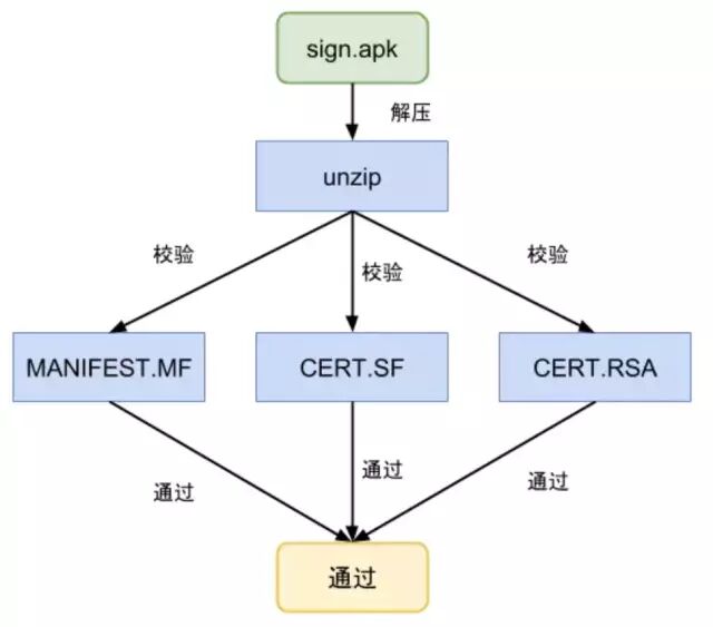 使用证书文件(RSA 文件)检验签名文件(SF 文件)没有被修改过。