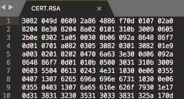 这里看到的都是二进制文件,因为 使用RSA 加密了,所以我们需要用 openssl 命令才能查看其内容,如下所示。
