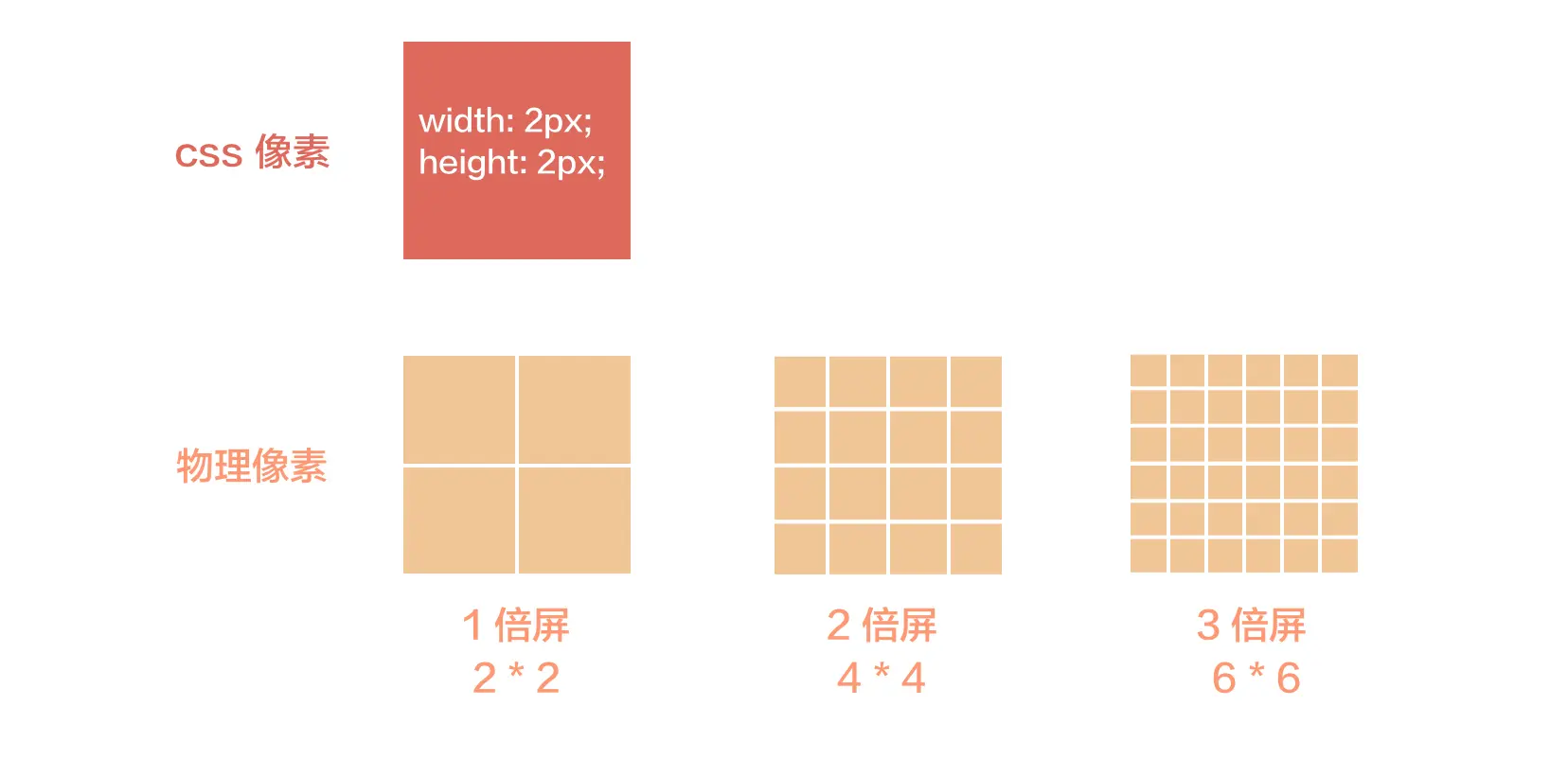 在 DPR 为 2 的设备(二倍屏)上,使用 2 * 2 个物理像素展示一个 CSS 像素。