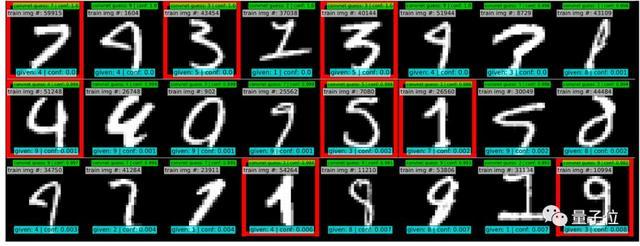 原始MNIST训练数据集的标签错误使用rankpruning算法进行识别。描述24个最不自信的标签,从左到右依次排列,自顶向下增加自信(属于给定标签的概率),在teal中表示为conf。预测概率最大的标签是绿色的。明显的错误用红色表示。