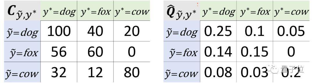 我们假设有一个数据集包含狗、狐狸和奶牛的图像。CL的工作原理就是估计噪声标签和真实标签的联合分布(下图中右侧的Q矩阵)。