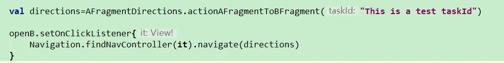 这里直接声明了该fragment需要一个String类型的参数,在A中调用Navigate方法如下