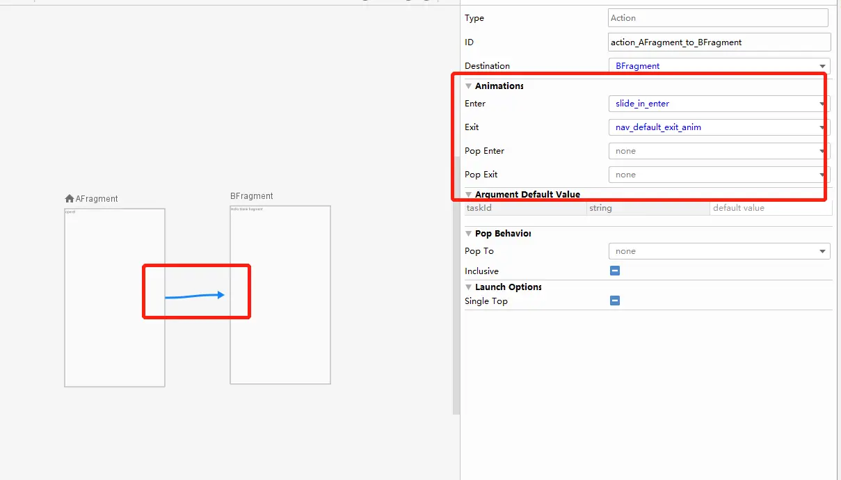 这里的args就会解析到getArgument的值。不仅仅是传值,还可以设置动画,这里选中箭头,然后在右侧的Animation中选择相应的动画即可,这里有系统默认的,也可以在res/anim目录下建自己想要的动画