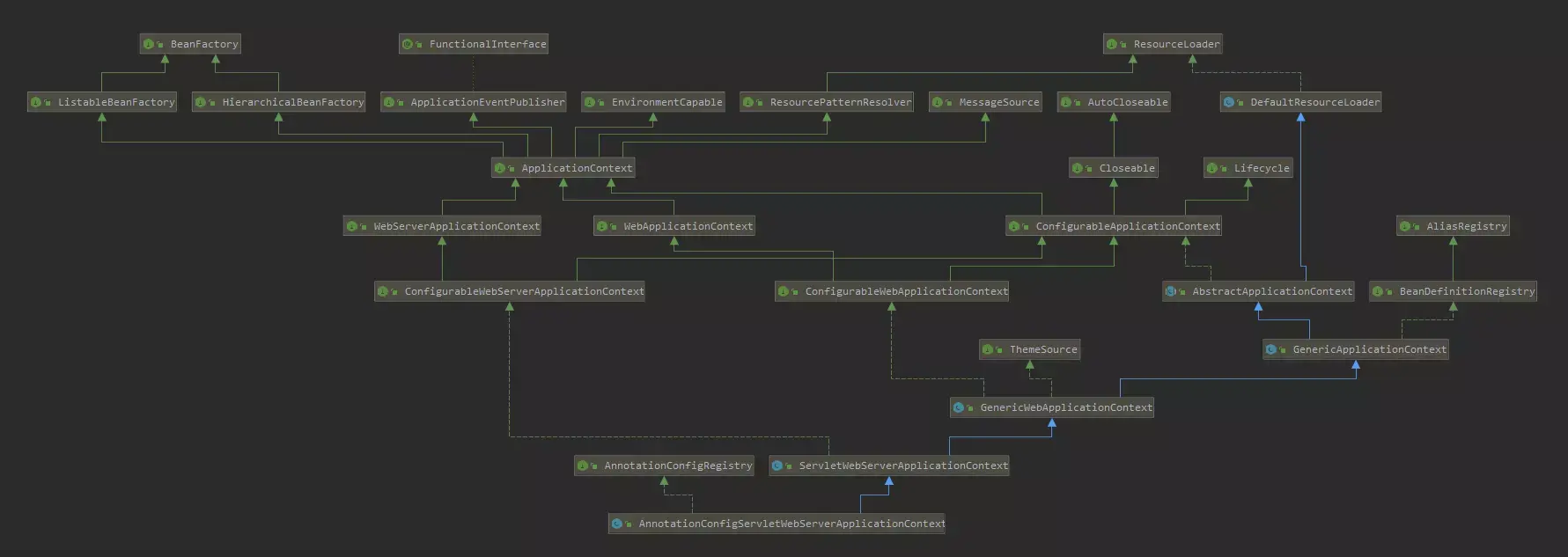 ` 对应三种类型,web应用构建上下文默认为AnnotationConfigServletWebServerApplicationContext。我们可以来看一下AnnotationConfigServletWebServerApplicationContext的实例图。