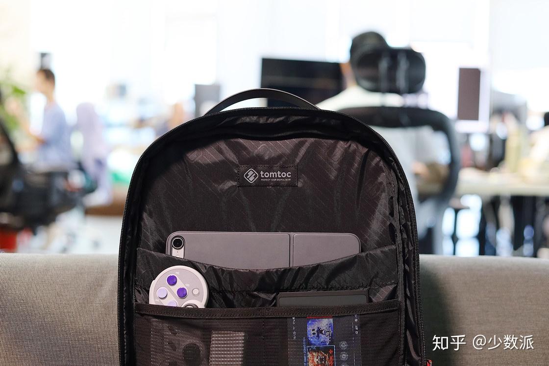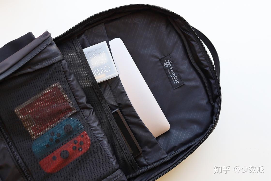 第二,它很能装,内胆隔层很多。我一般会把电脑装在最靠近背部的电脑仓口袋里,里面的隔层拿来放 iPad。因为这个口袋最贴近背部,大尺寸的重物放这里比较省力。主仓的口袋最大,也是正常形态的书包口袋,我则会用来放书籍、文件之类的较大的物品。最前拉链的小隔层里放充电宝、Kindle、Switch,因为这些物品在外出路上会用的,放在前面比较方便,有隔层设计也可以有效防止晃动。包的正面还有一个横向拉链,装那些经常取用的小东西正合适,比如纸巾、钥匙等。tomtoc 包还有很大的侧边口袋,装茶杯、雨伞都可以。