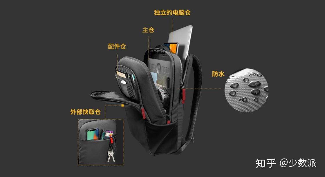 解决分区太少:少数派定制背包有大容量与合理的分区,提供了四个仓,包括电脑仓、主仓、配件仓和外仓。