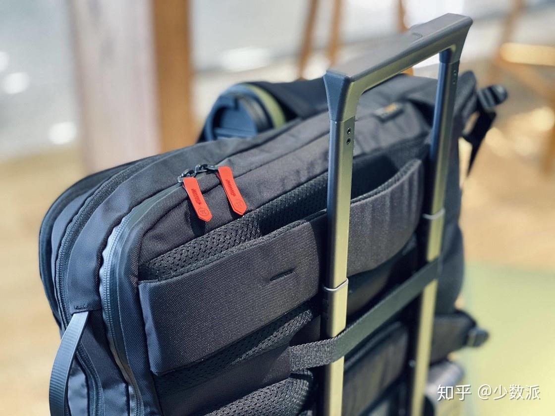 我是最早拿到样品背包,刚好碰上一次长达一周的德国之旅,在通风槽中隐藏了行李箱固定带让我同时带了旅行箱和背包的舟车劳顿中也非常从容。