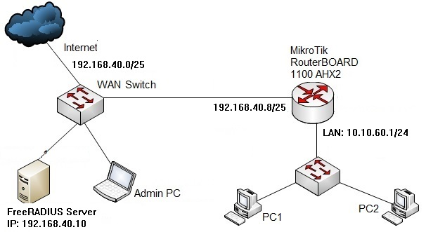 So, MikroTik Router can see freeRADIUS Server through WAN interface and WAN switch.