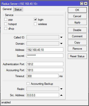 - Put freeRADIUS server IP address (192.168.40.10) in Address input field.