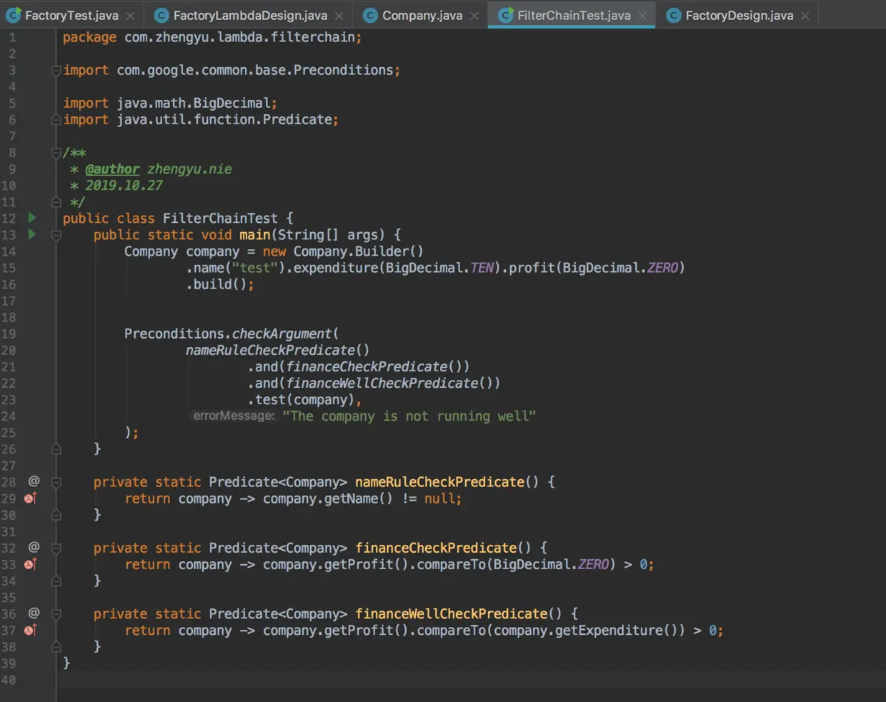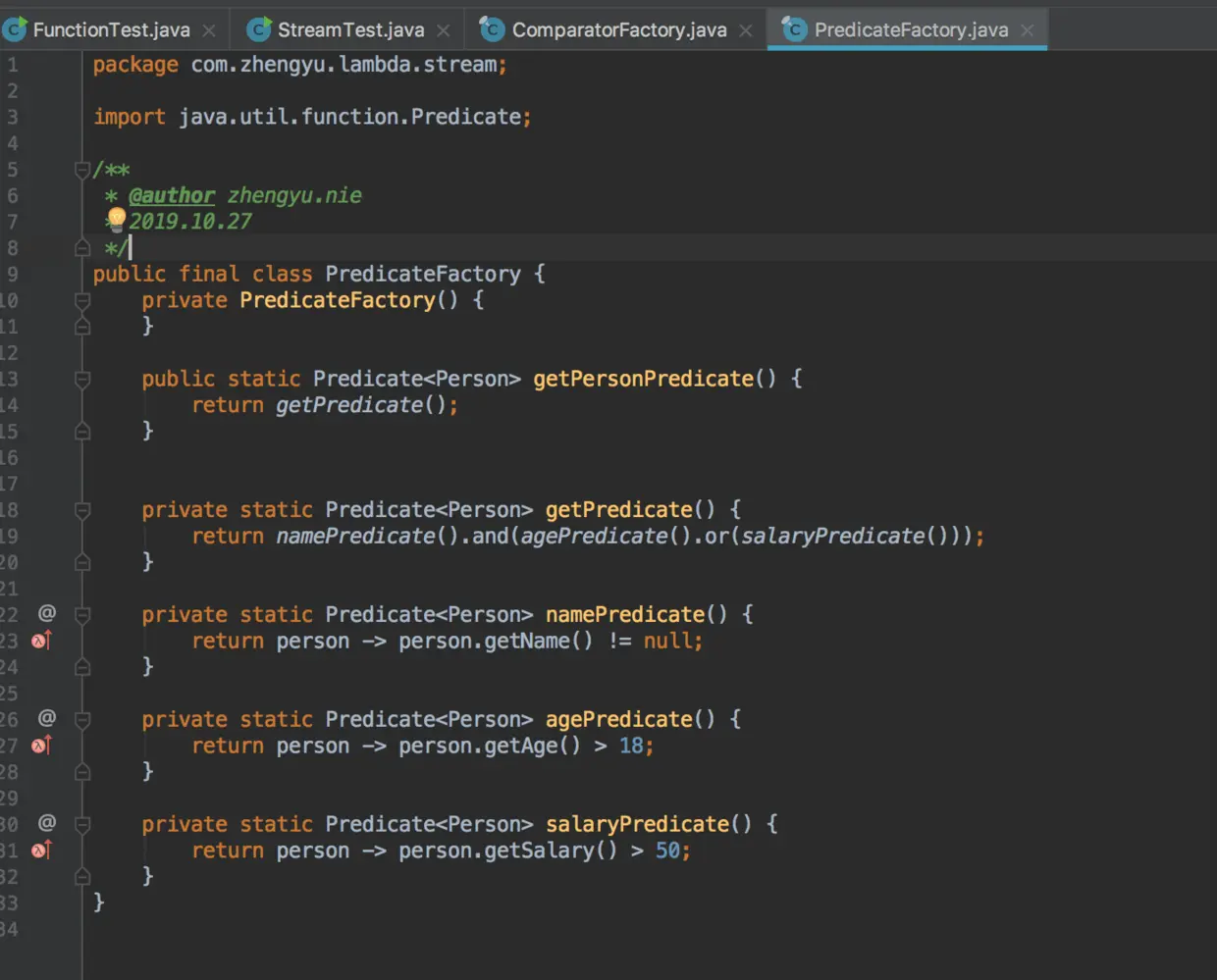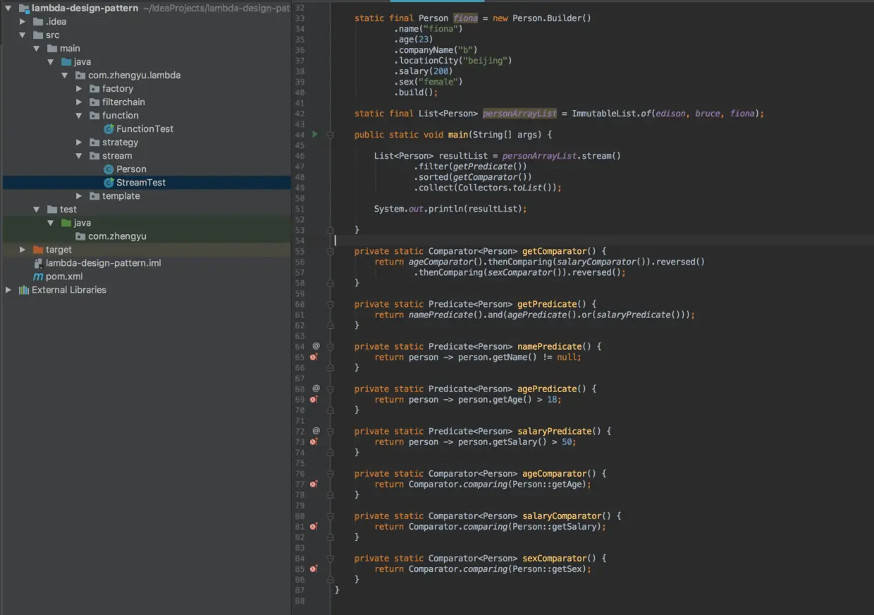 在可读性上提高是非常有效果的,因为predicate、consumer、comparator等函数式接口组合起来,就可以用一个method表明组合之后的功能,然后丢进一个stream流中,从上读到下,便清楚了整个stream流做了什么。