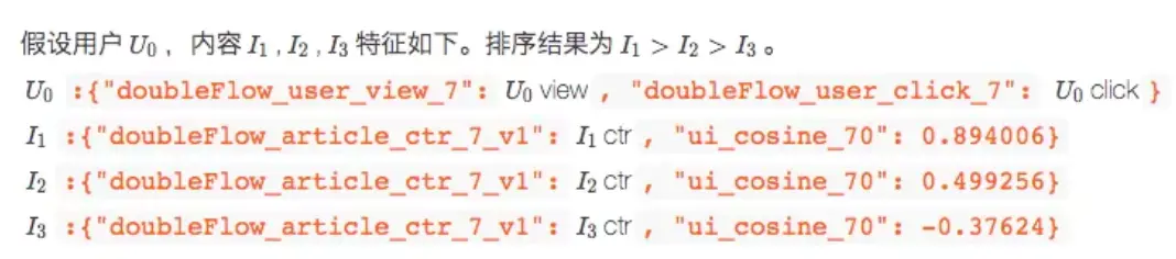 模型预测值logit_output_value,0.094930>0.073473>0.066176,所以排序结果为 I1> I2>I3,U0-I1 的预测值为0.094930,特征 doubleFlow_article_ctr_7_v1=_I1_ctr起到了 0.062029 的正向作用,使得预测值相较于基值,有增加的趋势。同理,ui_cosine_70=0.894006,起到了 0.188769 的正向作用。
