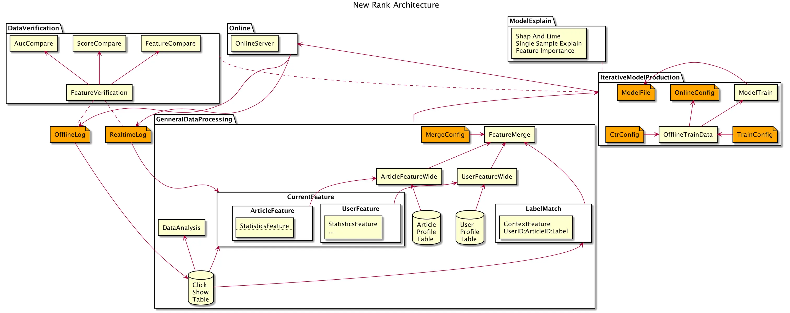各个模块的功能以及他们之间的交互使用 JSON 配置文件进行集成,使模型的训练和上线仅仅需要修改配置就能完成,极大提升了开发效率,为排序算法的快速迭代打下了坚实的基础。