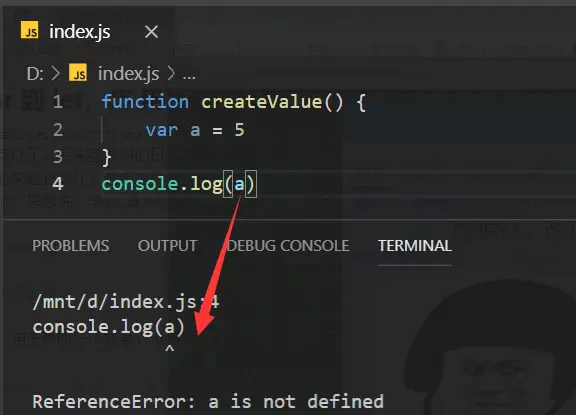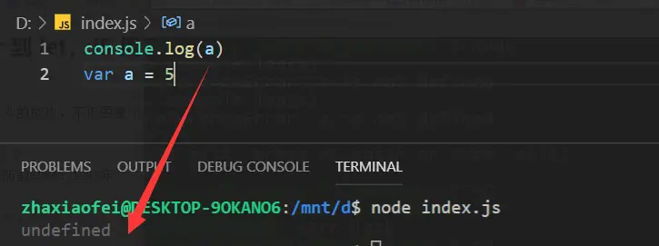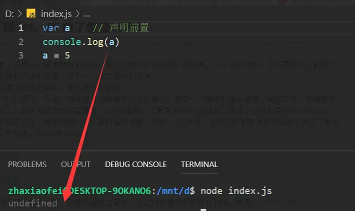 上面的代码中,第一行使用了变量 a,在c语言中,还没声明一个变量就使用,是会直接报错的,但在JS中不会,而是会输出 undefined