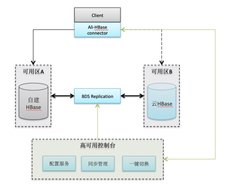 控制台提供一键切换不需要重启客户端,提供AliHBaseConnector作为原生HBase客户端的一个插件,插件内部会封装主备切换逻辑。客户端启动时会从BDS获取主备地址信息同时建立一个高可用的命令通道,控制台发出的切换命令通过该通道到达客户端,客户端自动的断开旧链接,打开备库链接并重试请求。
