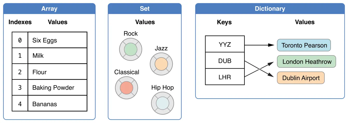 var airports: [String: String] = ["YYZ": "Toronto Pearson", "DUB": "Dublin"]机场字典声明的类型是[String:String],代表“字典的key是String,value也是String”。