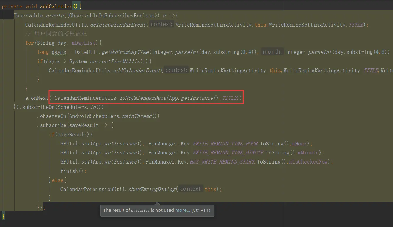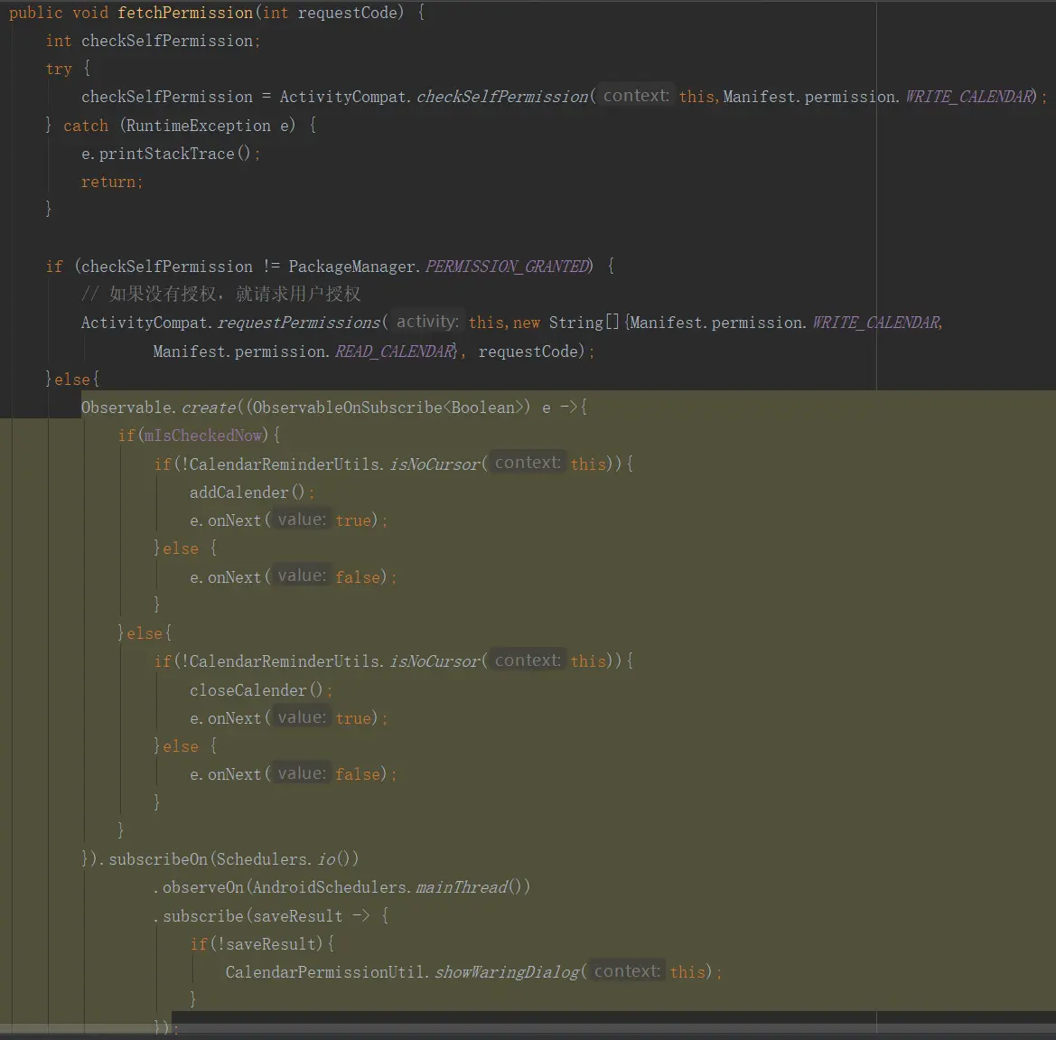 <uses-permission android:name="android.permission.WRITE_CALENDAR"/>其次,为了满足高API要求,还需要在实际使用的地方动态申请日历权限,代码如下,这里面的rxjava代码暂时不看,后面会讲到