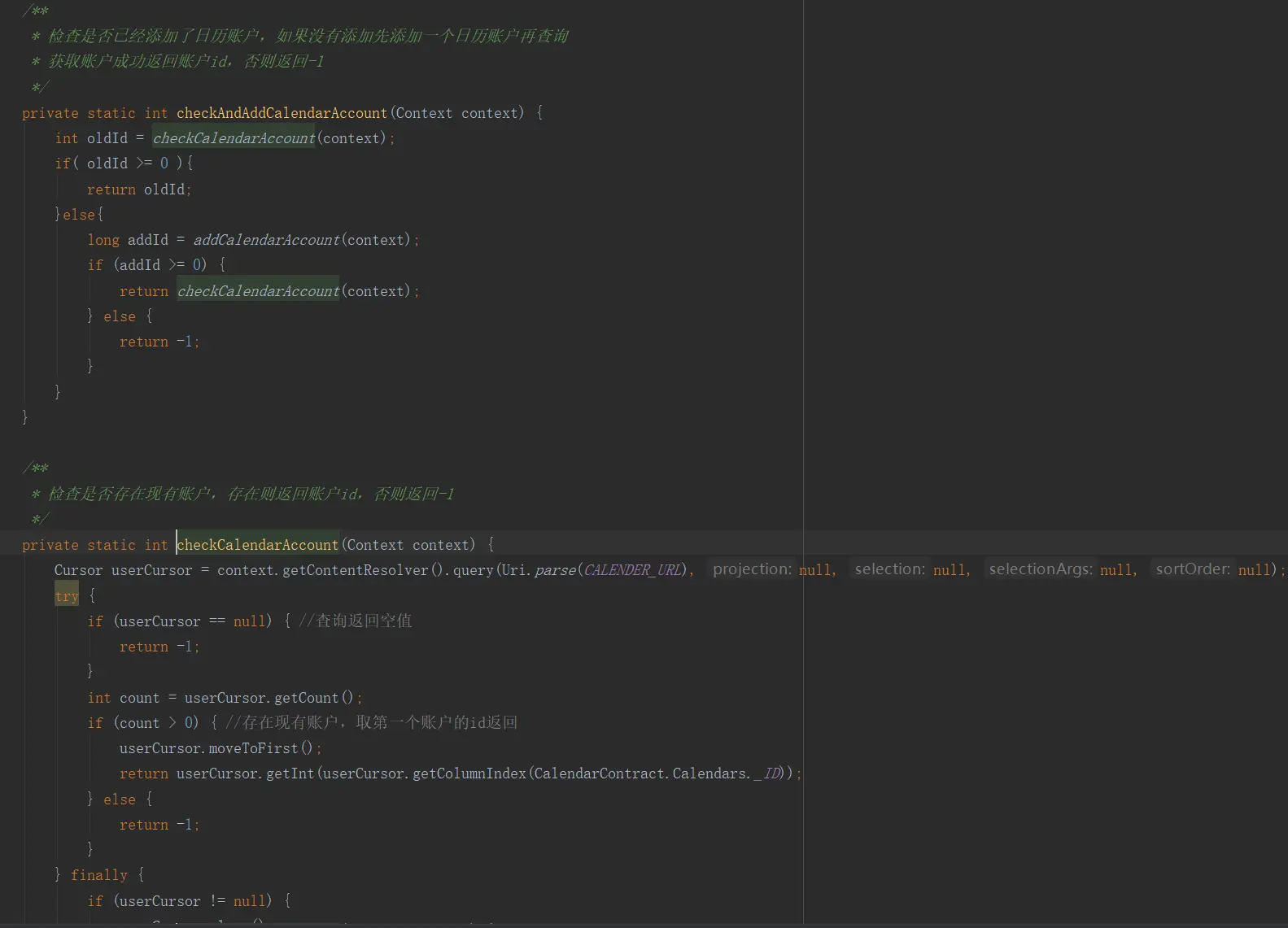 这问题真的是头痛了半天,这里必须吐槽一下。出问题的是oppo r9手机上,用户关闭了日历权限以后,系统给返回有权限,但是又写不进去日历。吐槽完了,问题还是得自己来解决,谁让测试小姐姐那么可爱呢。经过我一整套流程的debug,发现只要没权限,系统给返回的cursor一定是为null的,这样就有了解决思路了,只需要在每次执行插入和删除前多加一个cursor是否为null的判断就好了,说干就干,代码如下: