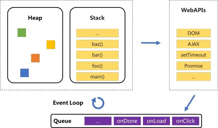 当 JS 代码开始执行的时候就是开始一个循环:Stack(栈)中为空,Queue(队列)中有一个 main 主函数,将 main 函数放入 Stack(栈)中,在主函数中会碰到一些 WebAPIs,如果是异步的通常都会有个 callback function(回调函数)当异步完成之后 WebAPIs 会将这个callback function(回调函数)放入 Queue(队列)中,当 Stack(栈)中的内容全部出栈的时候就开始下一个循环将 Queue(队列)第一个任务放入栈中以此循环执行下去。