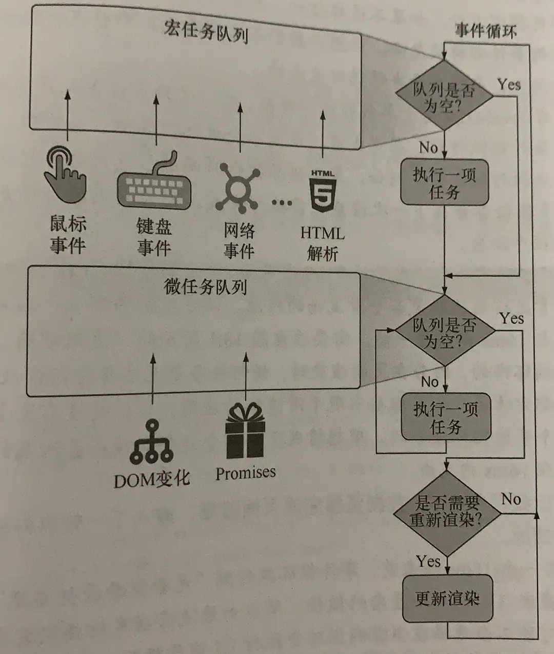 这里借用一下 《JavaScript 忍者秘籍》的图,如果所示这就是一个完整的 Event Loop 牵扯到的东西,可以简单理解为将之前 Queue 分为了三个部分 Task(宏任务)队列、microTask(微任务)队列、UI渲染。循环步骤如下: