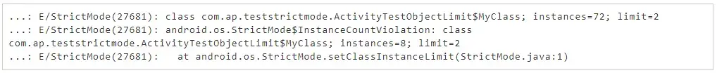@Override protected void onCreate(Bundle savedInstanceState) { super.onCreate(savedInstanceState);setContentView(R.layout.activitymain); this.textView = (TextView) findViewById(R.id.textview);this.textView.setText("In ActivityTestDetectCustomSlowCalls"); if(! isStrictMode){StrictMode.setThreadPolicy(new ThreadPolicy.Builder() .detectCustomSlowCalls() .penaltyLog() .build());isStrictMode = true; } this.slowCall1(); this.slowCall2(); }