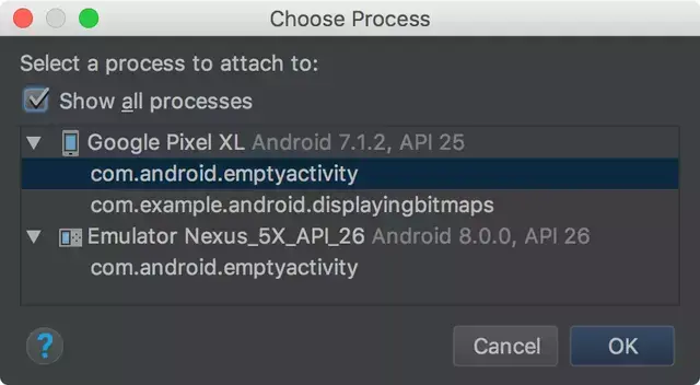- 在出现的 Choose Process 对话框中,选择您想要检查的应用进程,然后点击 OK。