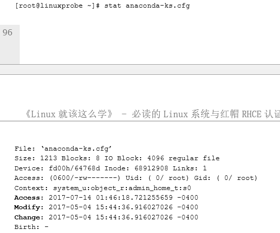 - Change:最后一次修改文件属性的时间(如修改 所有者/者名称、所有者/组的权限、文件所在目录等)