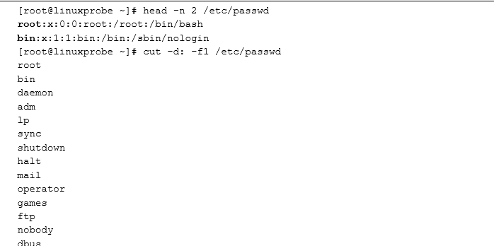 passwd在保存用户数据信息时,用户信息的每一项值之间是采用冒号来间隔的,接下来我们使用下述命令尝试提取出passwd文件中的用户名信息,即提取以冒号(:)为间隔符号的第一列内容: