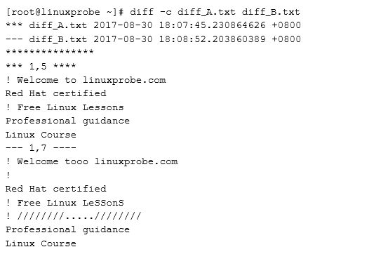 使用带有-c参数的diff命令来描述文件内容具体的不同(!即为差异项)