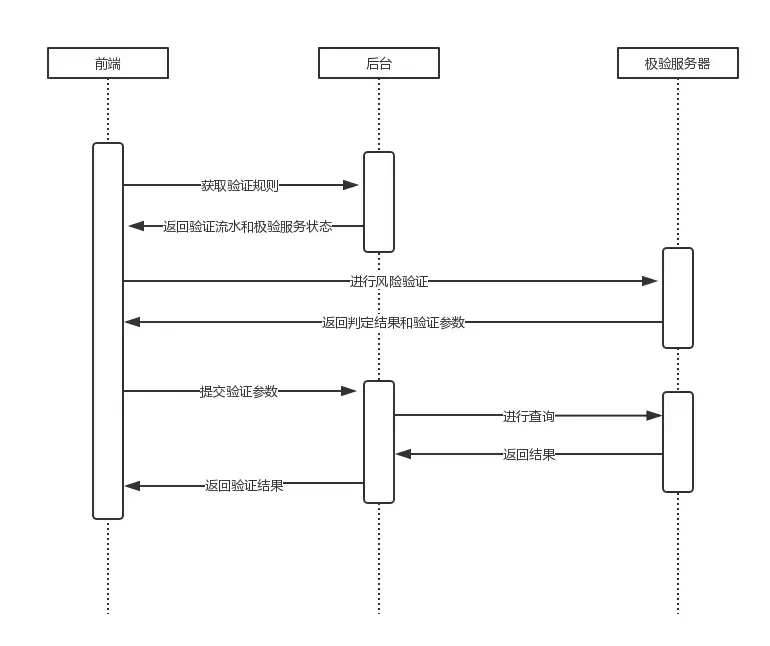 - 极验秘钥信息 + 用户行为 一并提交给 极验服务器 做判断,查验行为是否正确