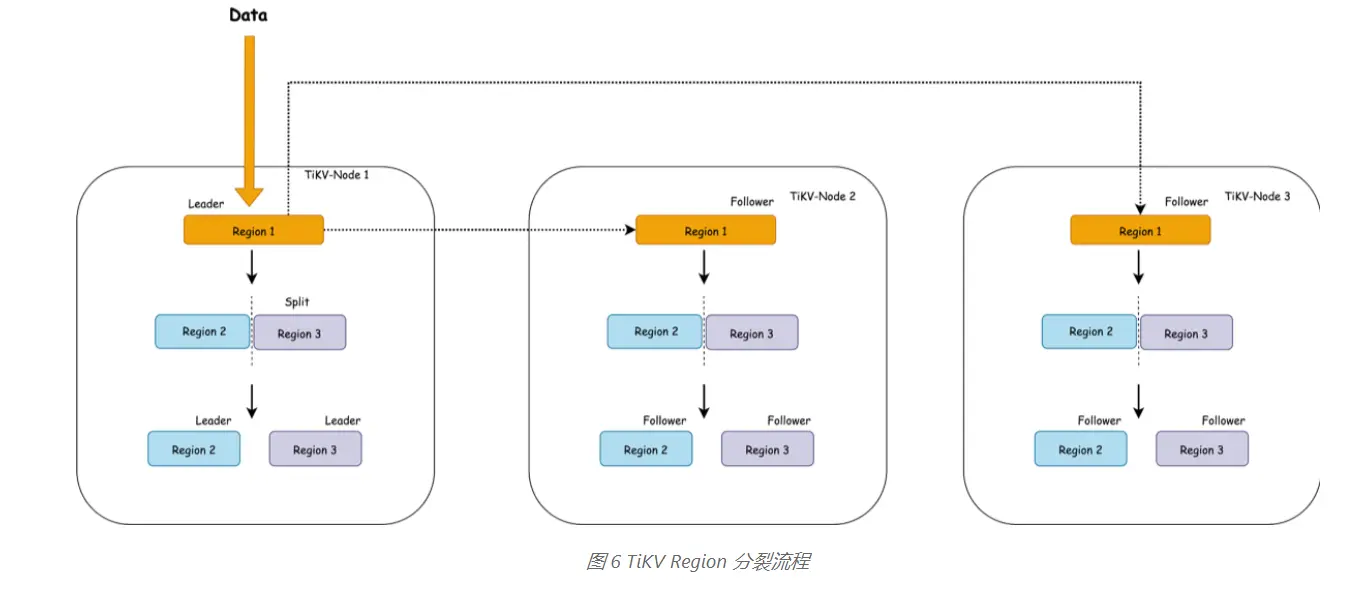 根据之前提到的内容,一个表在一开始的时候都是一个region,那么在做大量数据导入的时候就会发生所有数据都插入到一个region的情况继而产生了热点的问题。在一个region写满了之后会进行分裂(如下图所示)。比如由region1分裂为region2和region3,那么既然有新的region出来了肯定就会做选举,选举出新region对应的leader。就用下面的图来说,假设region1的leader在tikv-node1上面,在发生分裂之后进行选举,因为是谁分裂谁先发起选举,所以region2和region3的leader大概率也会在TIKVnode1上面,那么这个时候就算做了分裂,因为region2、region3的leader都在tikvnode1上面,所以node1依然会承担大量的写入压力。需要等待pd根据tivk周期性的心跳信息分析判断,然后生成调度计划,最后在调度计划成功执行之后,热点的问题才能逐渐被解决。