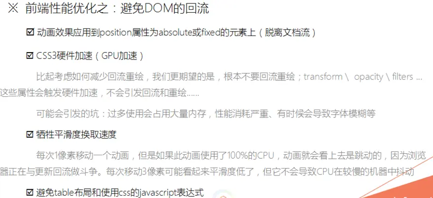 - css3硬件加速(GPU加速) 比起考虑如何减少回流重绘,我们更期望的是,根本不要回流重绘; transform\ opacity \ fiters .. 这些属性会触发硬件加速,不会引发回流和重绘. ..