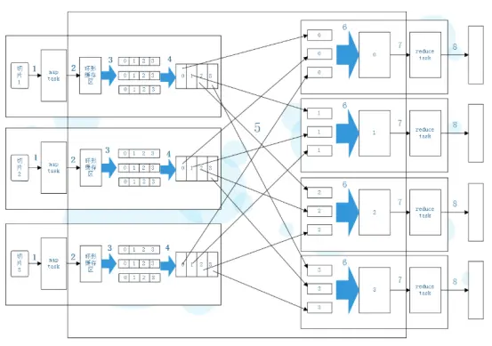 - 从过程2到过程7之间,即map任务和reduce任务之间的数据流称为shuffle(混洗,很多人也称之为洗牌),而过程5最能体现出混洗这一概念。一般情况下,一个reduce任务的输入数据来自与多个map任务,多个reduce任务的情况下就会出现如过程5所示的,每个reduce任务从map的输出数据中获取属于自己的那个分区的数据。