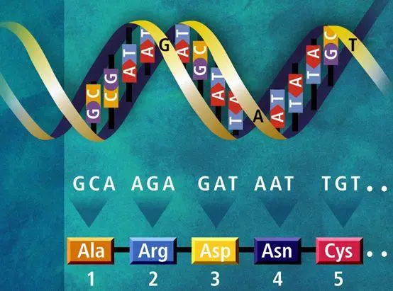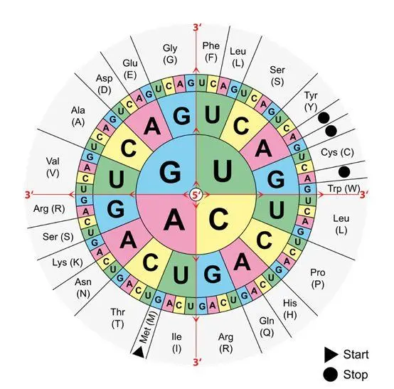也就是说,21种相应的氨基酸可以组成64种可能的三联体(4^3—4个核苷的三重体)。例如,氨基酸ala(丙氨酸)编码为 gca、gcg、gcc或gct。