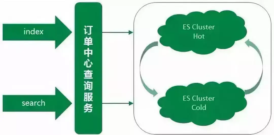 考虑到ES集群暂时没有很好的主备方案,同时为了更好地控制ES数据写入,我们采用业务双写的方式来搭设主备集群。每次业务操作需要写入ES数据时,同步写入主集群数据,然后异步写入备集群数据。同时由于大部分ES查询的流量都来源于近几天的订单,且订单中心数据库数据已有一套归档机制,将指定天数之前已经关闭的订单转移到历史订单库。