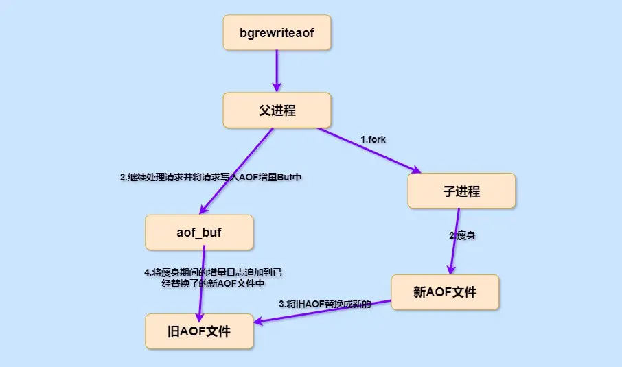 这是一条 AOF 重写命令(上述的重写过程其实就是 bgrewriteaof),和 bgsave 一样,Redis 也是会 fork 一个子进程,让子进程去负责 AOF 文件的重写。大致流程如下: