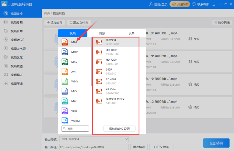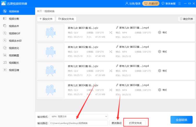 5、以上参数都调整好后点击全部转换把添加好的qlv格式由上至下依次转换成需要转换的mp4格式并保存到指定的输出路径中。